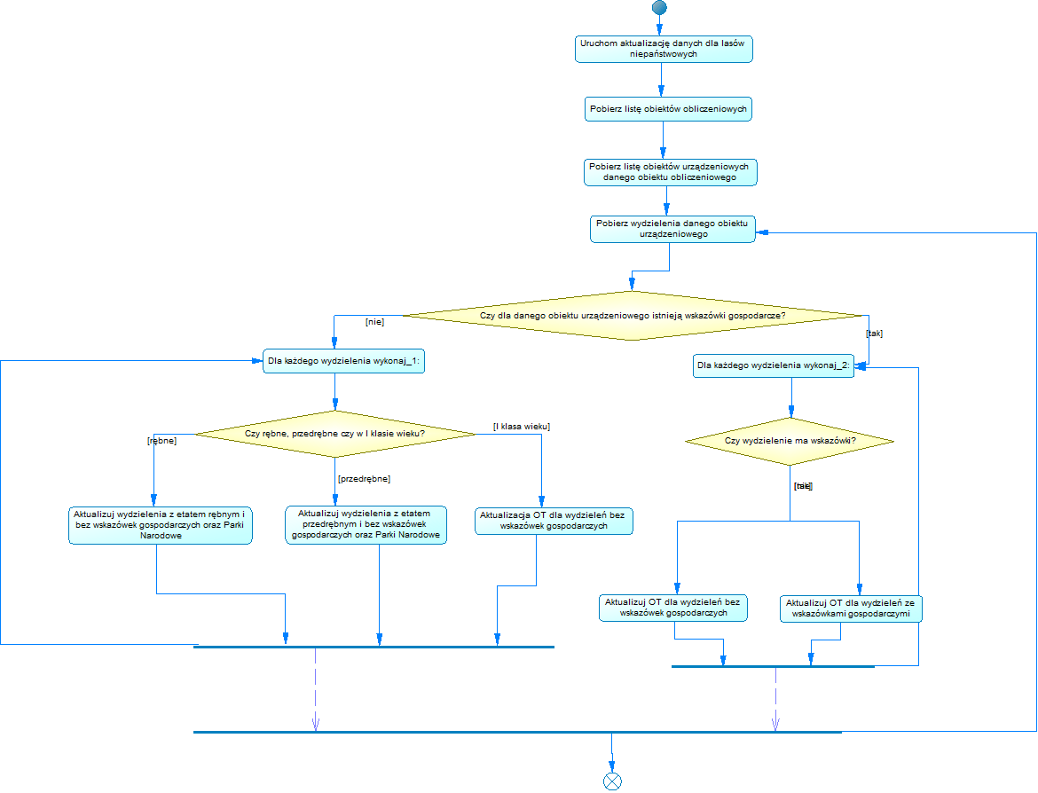 - Zaktualizowany opis taksacyjny drzewostanów. W związku z tym, że podmioty prowadzące nadzór nad lasami poza zarządem PGL LP nie przekazują do BDL corocznie zmiany stanu lasów w opisach taksacyjnych (obliczone przyrosty masy drzewnej, wiek drzewostanów, zmiany użytkowania, wykonane zabiegi), w oprogramowaniu obliczeniowym BDL przeprowadzona jest aktualizacja stanu lasu do stanu na dzień 1 stycznia danego roku według autorskiego algorytmu opracowanego w BULiGL. Podkreślić należy, że wykonana aktualizacja nie odzwierciedla rzeczywistego stanu lasu na gruncie, stanowi natomiast symulację zmian, jakie mogą zajść w drzewostanach, przeprowadzaną na podstawie dostępnych danych z opisu taksacyjnego. Schematyczny algorytm przebiegu procesu aktualizacji przedstawiono na rysunku.