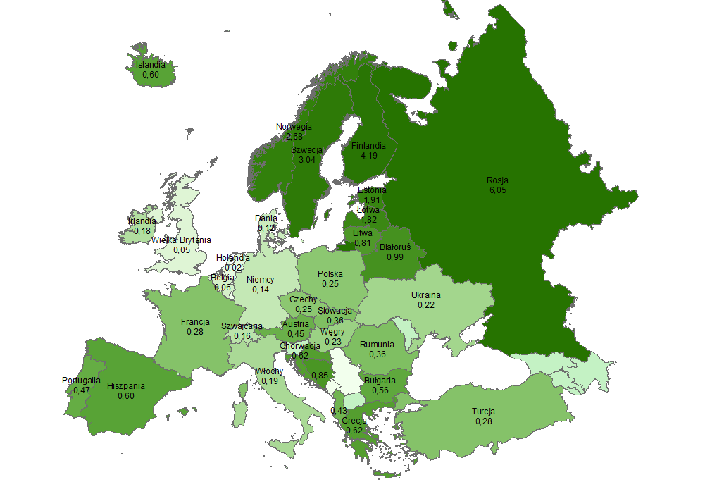 Do krajów o największej powierzchni lasów przypadającej na 1 mieszkańca należą: Rosja (6,05 ha), Finlandia (4,19 ha) oraz Szwecja (3,04 ha). Natomiast najmniej powierzchni leśnej przypada na 1 mieszkańca w Holandii (0,02 ha) oraz w Wielkiej Brytanii (0,05 ha). Z kolei dla Polski na 1 mieszkańca przypada średnio 0,25 ha lasów.