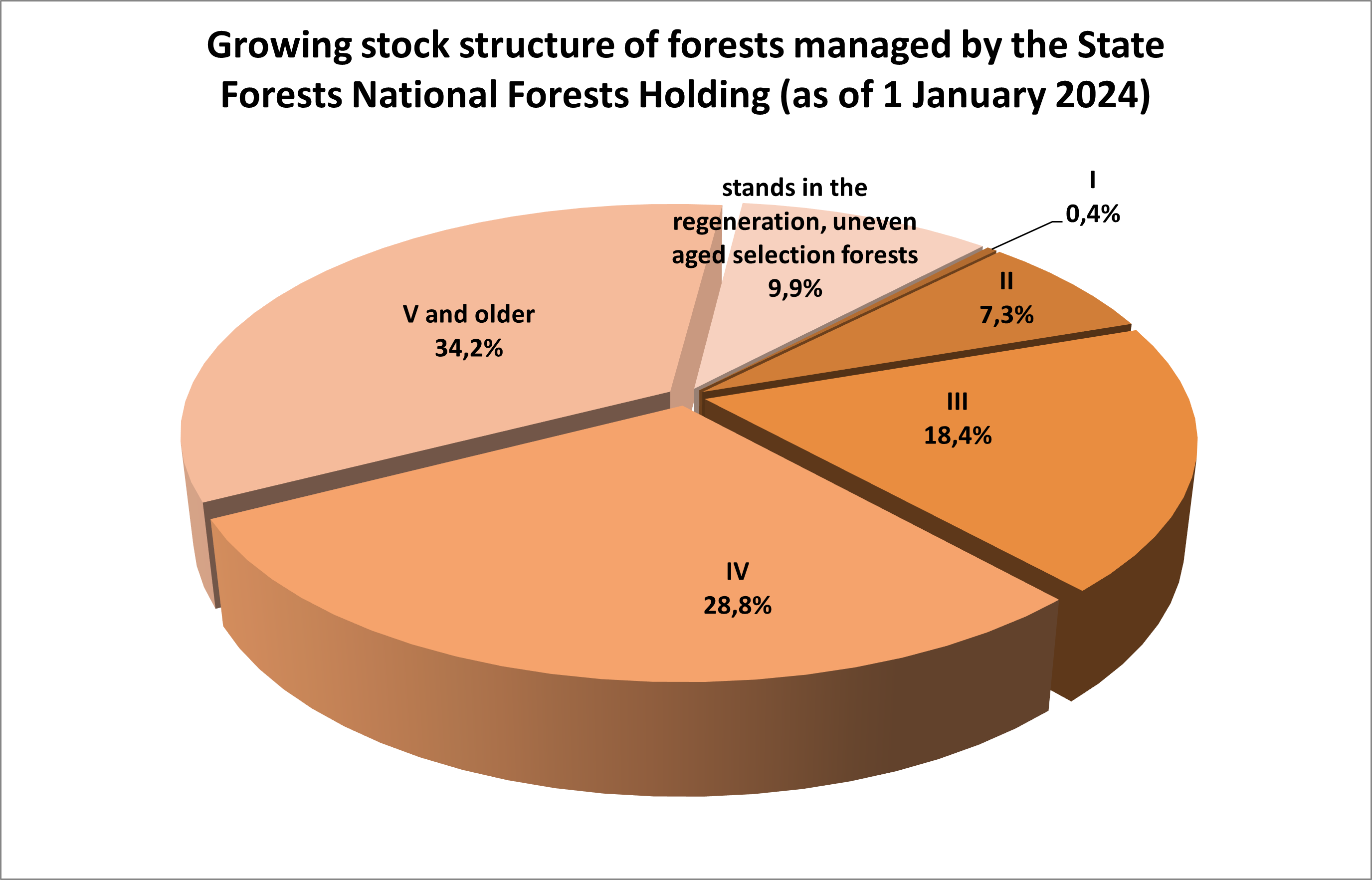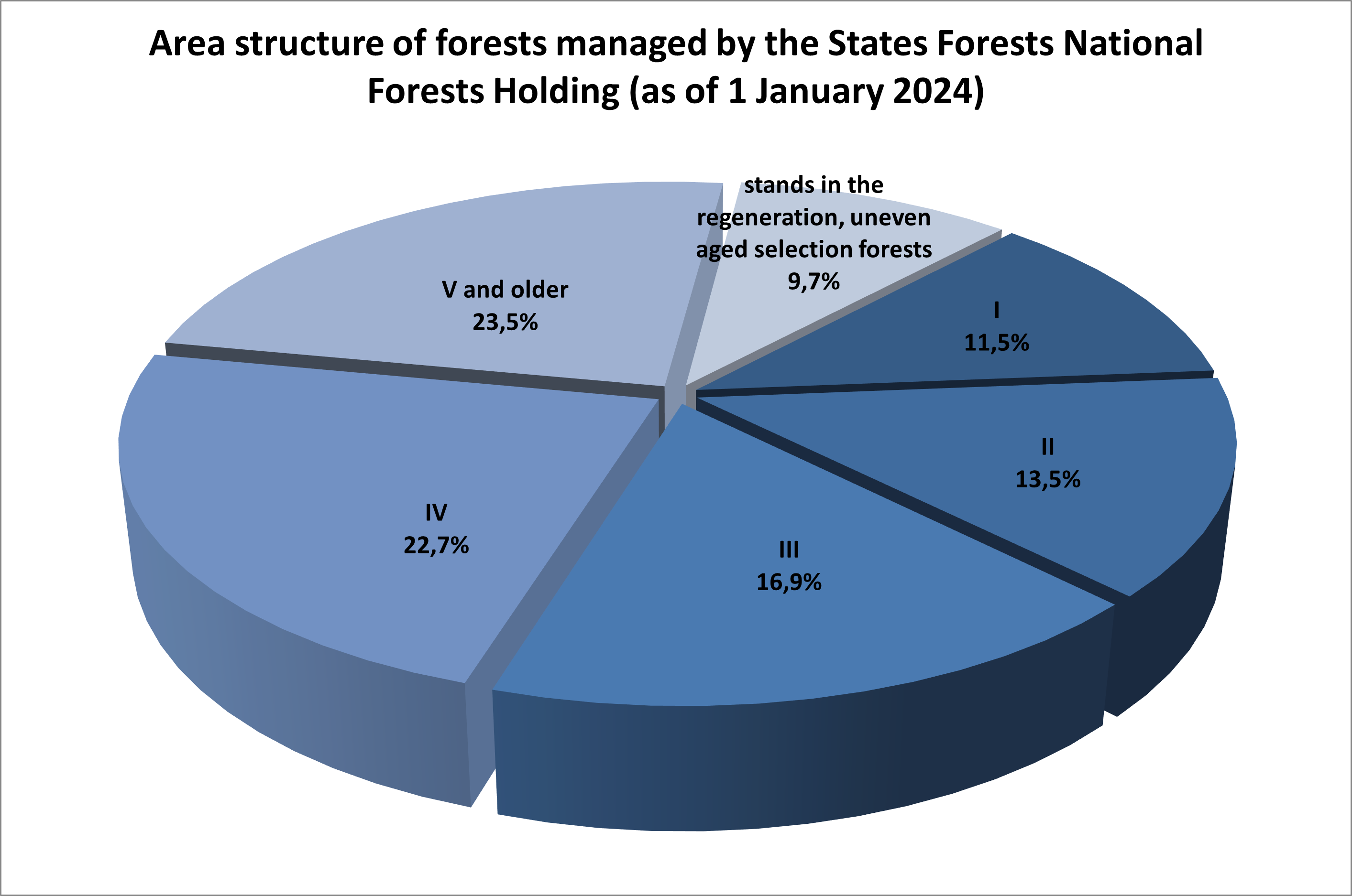 The total area of forests administerd by the State Forests – as of 1 January 2024 amounted to 7 144,1 thousand hectares, growing stock - 1 926 mln m3 with an average stand age of about 64 years. The average volume on afforested land is 275 m3/ha.