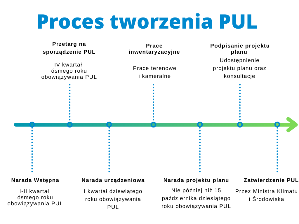 Następnie zostaje opracowana SWZ oraz ogłaszany jest przetarg na sporządzenie PUL przez podmioty zewnętrzne. Powinno to nastąpić nie później niż do końca IV kwartału ósmego roku obowiązywania dotychczasowego planu urządzenia lasu.